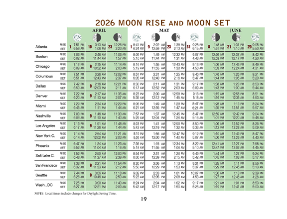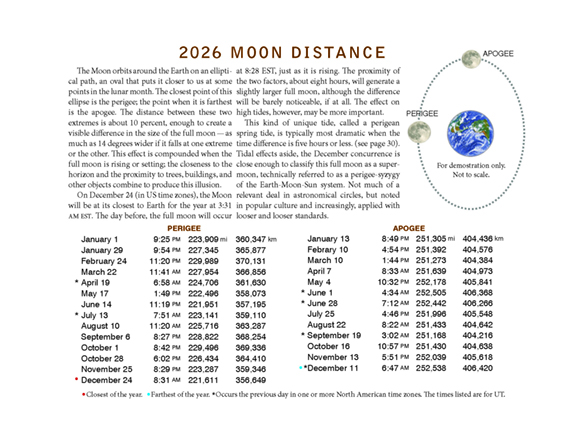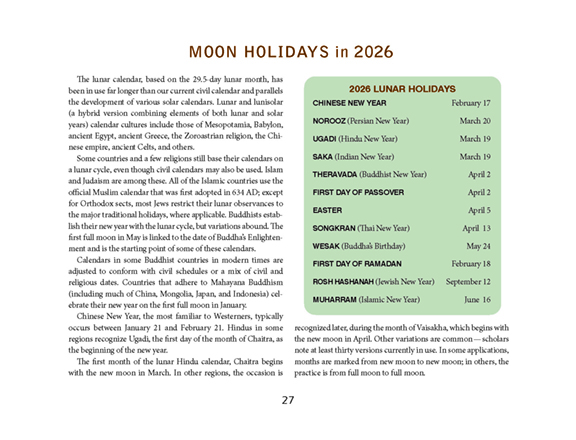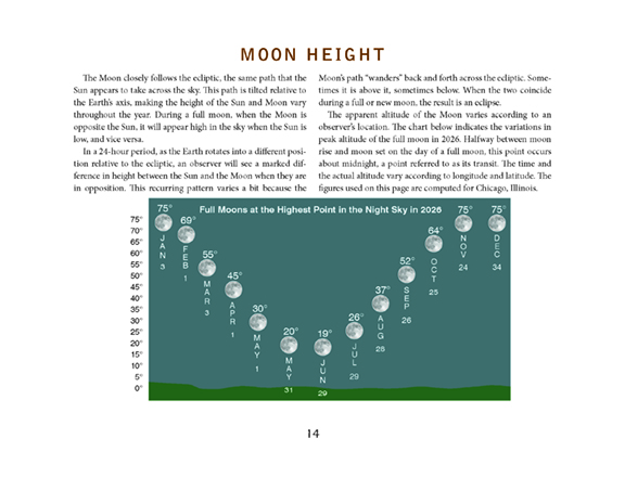 What's inside? Times for all North American time zones for full moon, new moon, first quarter moon, and last quarter moon phases. Definitions and graphic examples of the moon in its vartious phases, average durations of phases, and how lunations compare over time. Moon perigees and apogees, including closest and farthest distances for 2026. For 15 major U.S. cities, local rising and setting times for first quarter moons, full moons, and last quarter moons. Where on the horizon the full moons rise and set for 2026, for 15 major U.S. cities. Maximum height in the sky for each full moon. Guidelines for observing the earliest first crescent moons. Sky sights near the moon for 2026 -- major planets and stars visible in urban areas without telescopes. Lunar and solar eclipses for the year -- two each in 2026, but not all will be visible from North America. Traditional Native American and colonial names for each full moon in 2026. Religious holidays around the world associated with the moon. A unique chart of the days of the year and the hours of moonlight for each, graphically displayed. Major high and low tide dates for 2026, with an explanation of factors associated with tidal forces. Plus ... a list of online moon resources and a glossary of key terms. |
